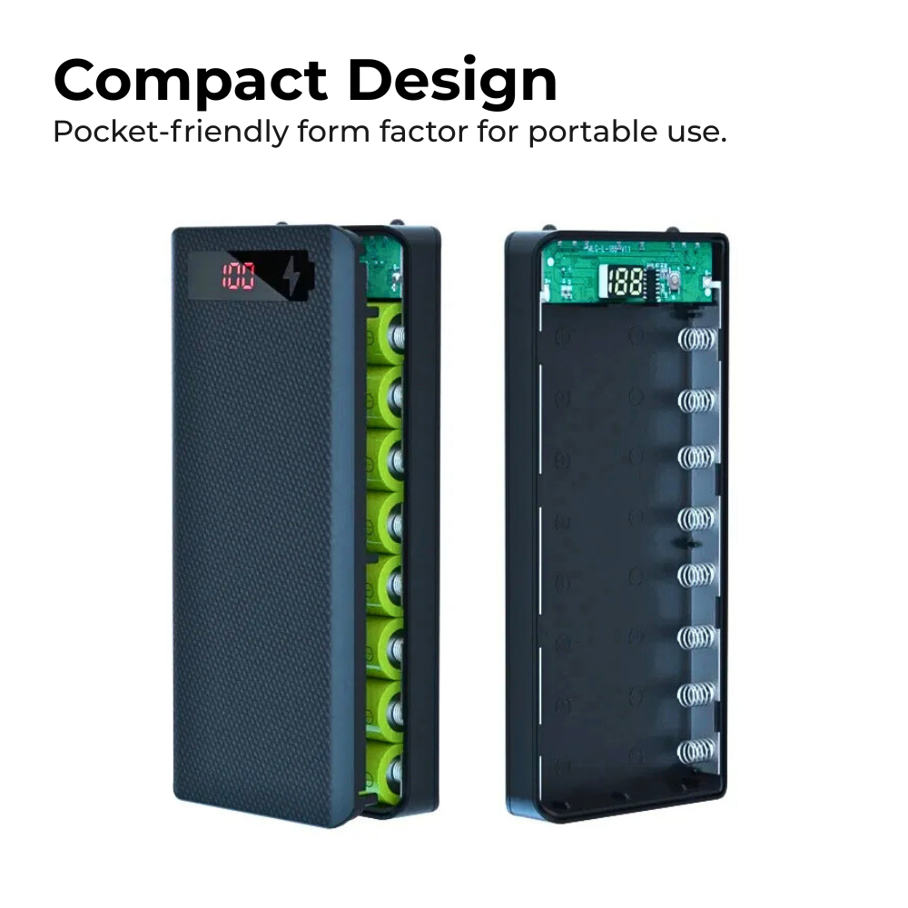 This DIY 8×18650 Power Bank Case gives you a professional, safe enclosure to build a high-capacity portable charger — featuring a durable textured shell, a pre-installed PCB with digital LCD that shows real-time status, and convenient USB ports for charging and output. Designed for makers and repairers, it keeps your 18650 cells securely aligned, prevents shorting with protective insulation and clear assembly guidance, and presents a neat, compact finish that’s perfect for gifting or selling your own custom power banks. Easy to assemble, built for safety, and made to make your custom power bank look and perform like a pro — batteries not included.