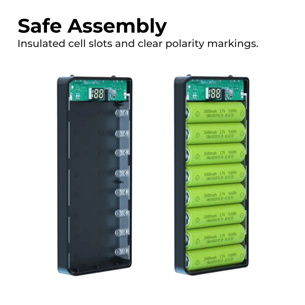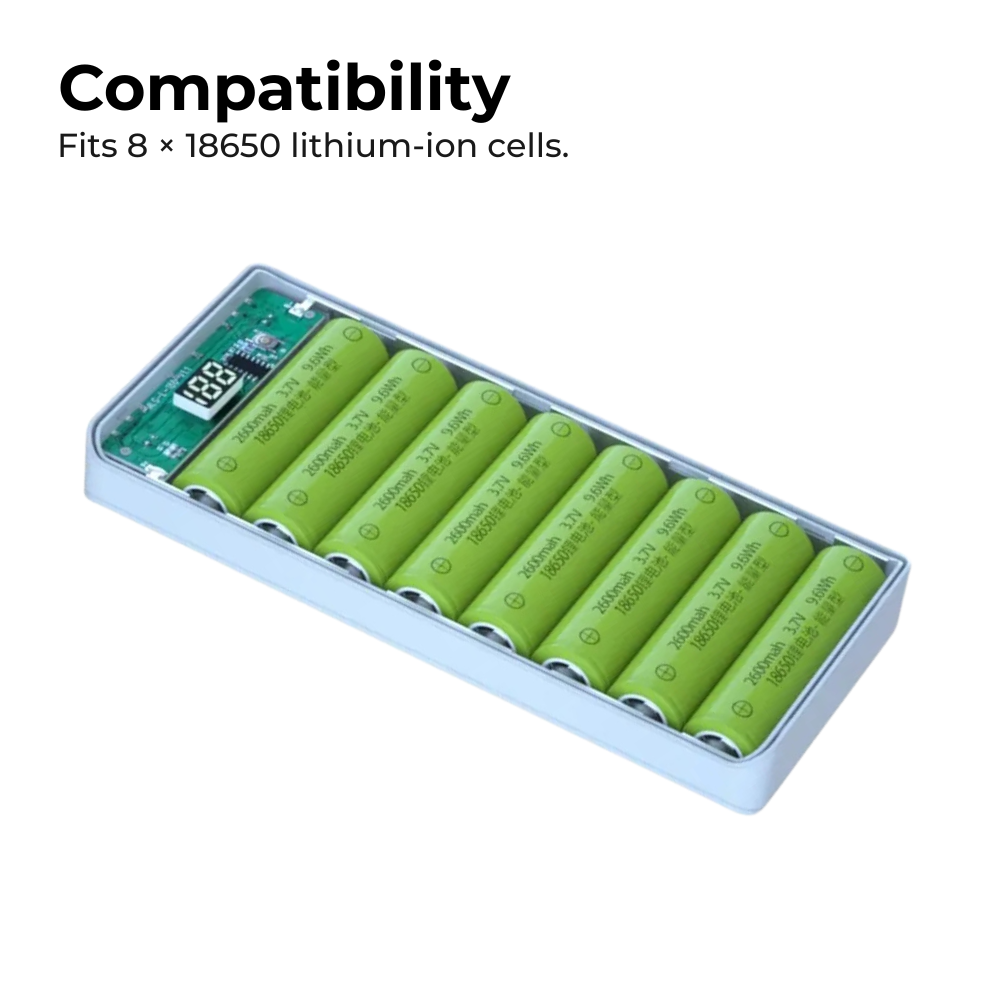 | Compatible Cells | 8 × 18650 lithium-ion cells (batteries NOT included) |