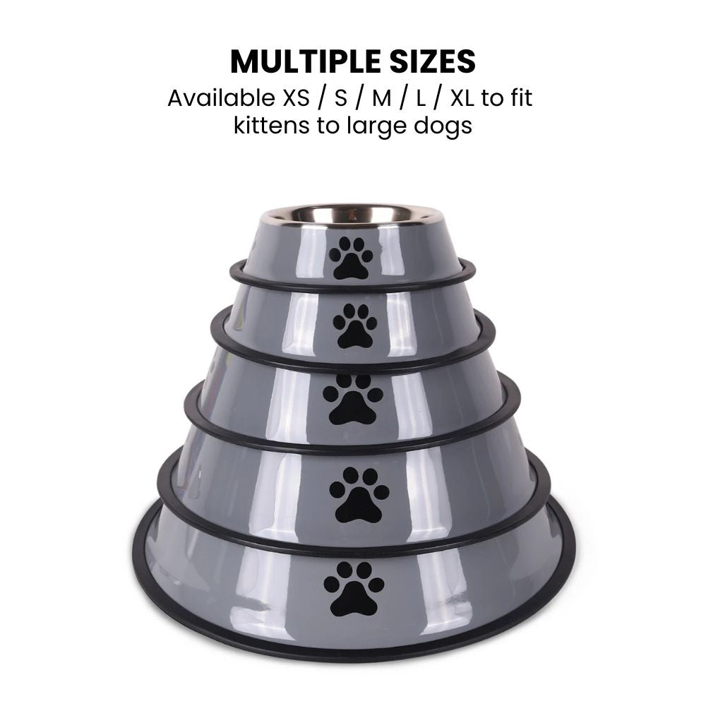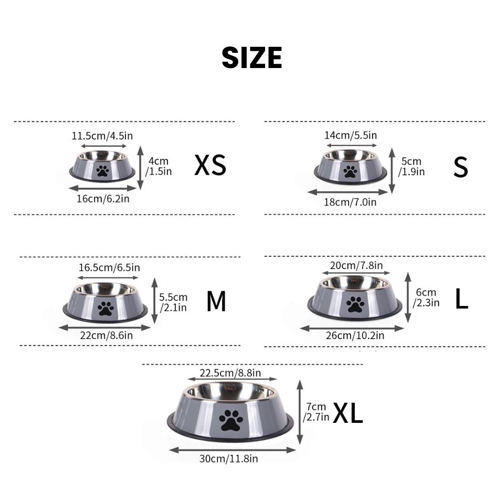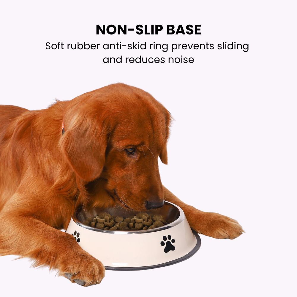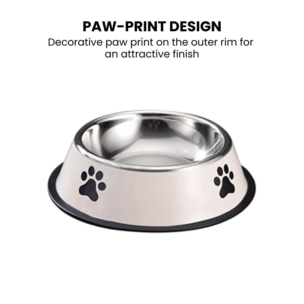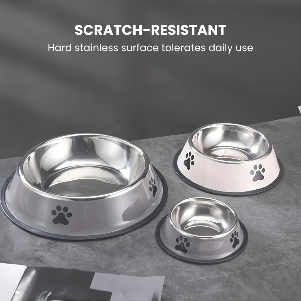 A premium stainless steel pet bowl designed to make mealtime cleaner, quieter and more reliable — the polished inner bowl resists stains and odors while the non-slip rubber base keeps the bowl steady during feeding; available in multiple sizes with a cute paw-print accent, it’s dishwasher-safe, rust-resistant, food-grade safe and stackable for easy storage, so whether you have a playful puppy or a picky cat this bowl gives you durable daily performance and simple cleanup in one attractive package.