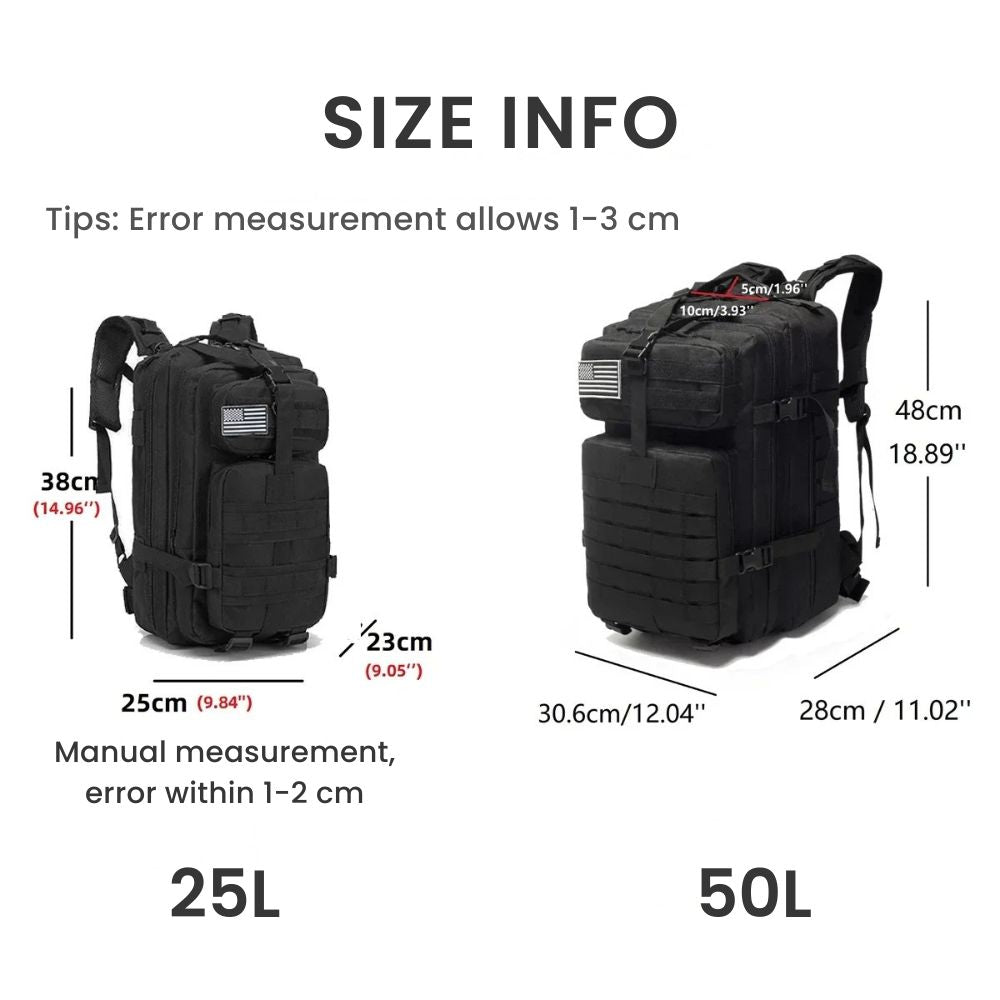 This rugged tactical backpack is built for outdoor enthusiasts who demand durability, functionality, and comfort. Whether you’re hiking, camping, traveling, or on daily duty, this bag delivers reliable performance with waterproof fabric, heavy-duty zippers, and a versatile MOLLE system. With spacious 25L and 50L capacity options, it offers multiple compartments to keep your gear organized and accessible. Adjustable straps and breathable padding ensure comfort even on long adventures, while its military-grade design makes it tough enough for any environment.