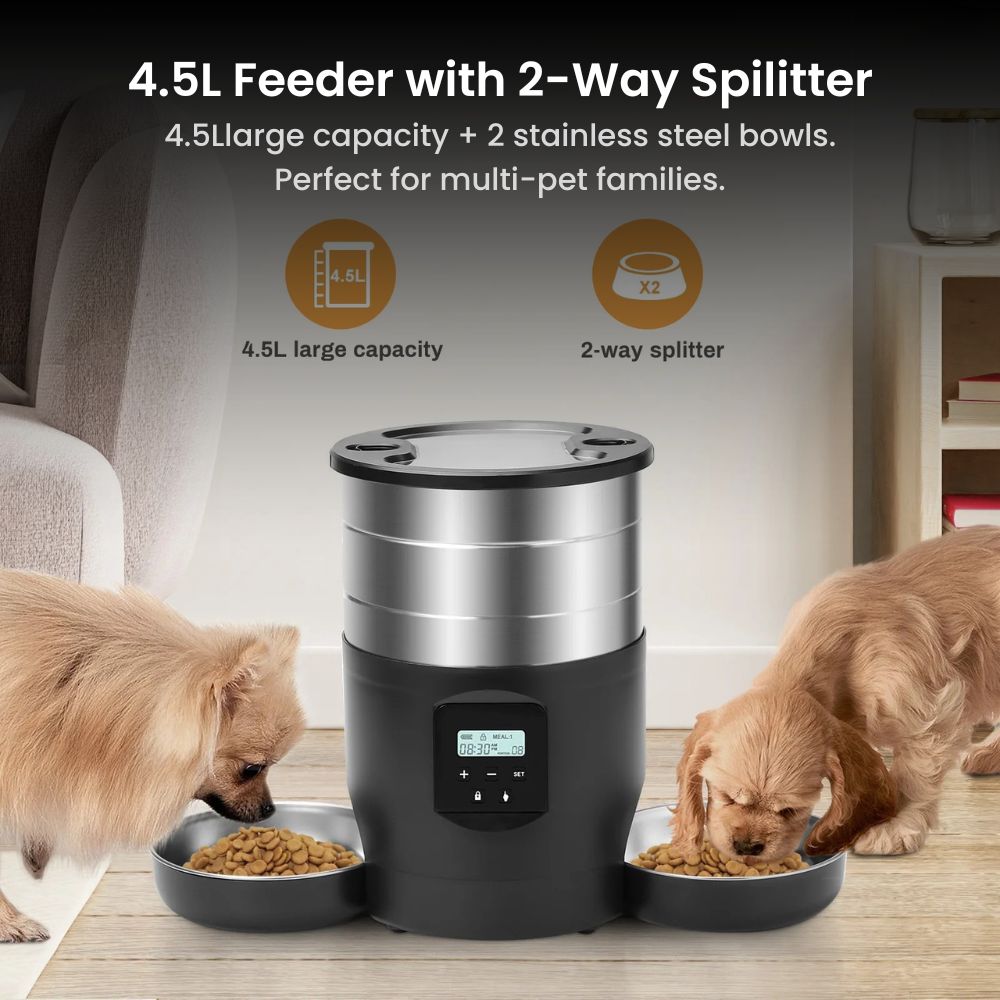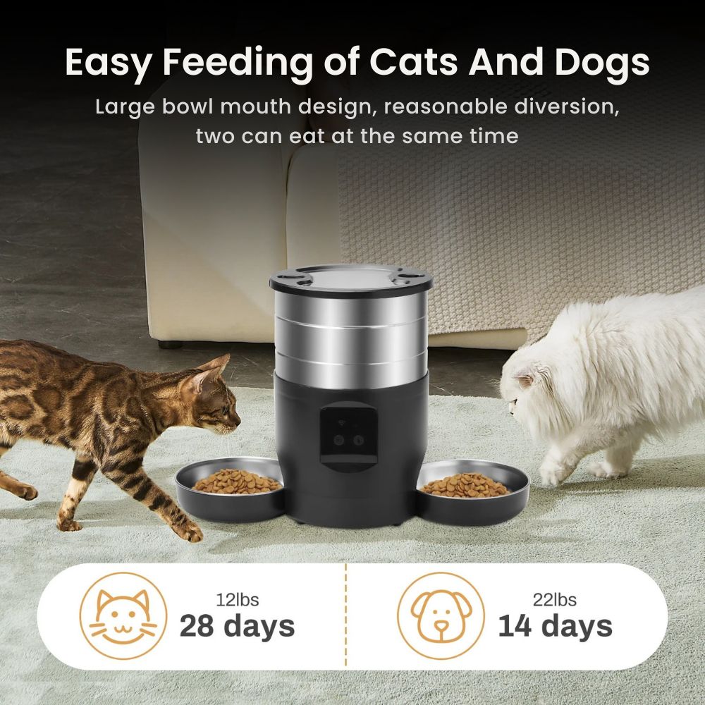 Simplify mealtime for your furry friends with this 4.5L smart automatic feeder designed for both cats and dogs. Featuring dual stainless steel bowls for hygienic feeding, WiFi app control for remote scheduling, and a voice recording function to call pets during meals, it combines convenience with care. The anti-clog mechanism ensures smooth food dispensing, while the locking lid keeps kibble fresh and secure. Compact yet spacious, this feeder measures 28cm tall and 19cm wide, making it the ideal solution for reliable daily feeding. Whether you’re home, at work, or away, you can keep your pets happy, healthy, and consistently fed.