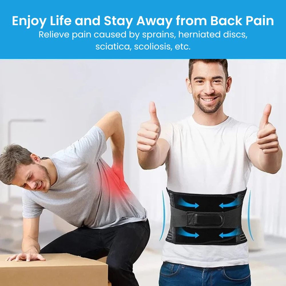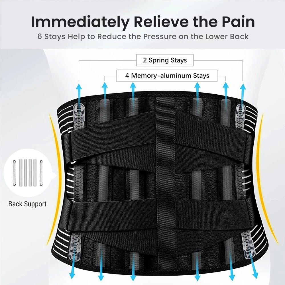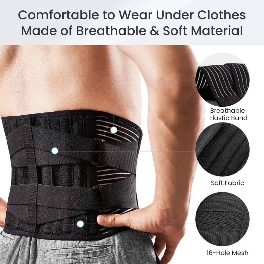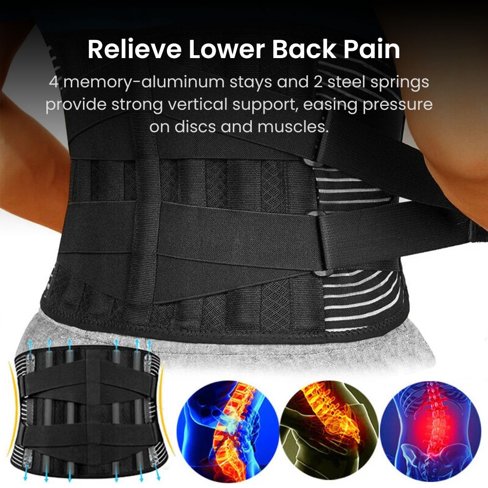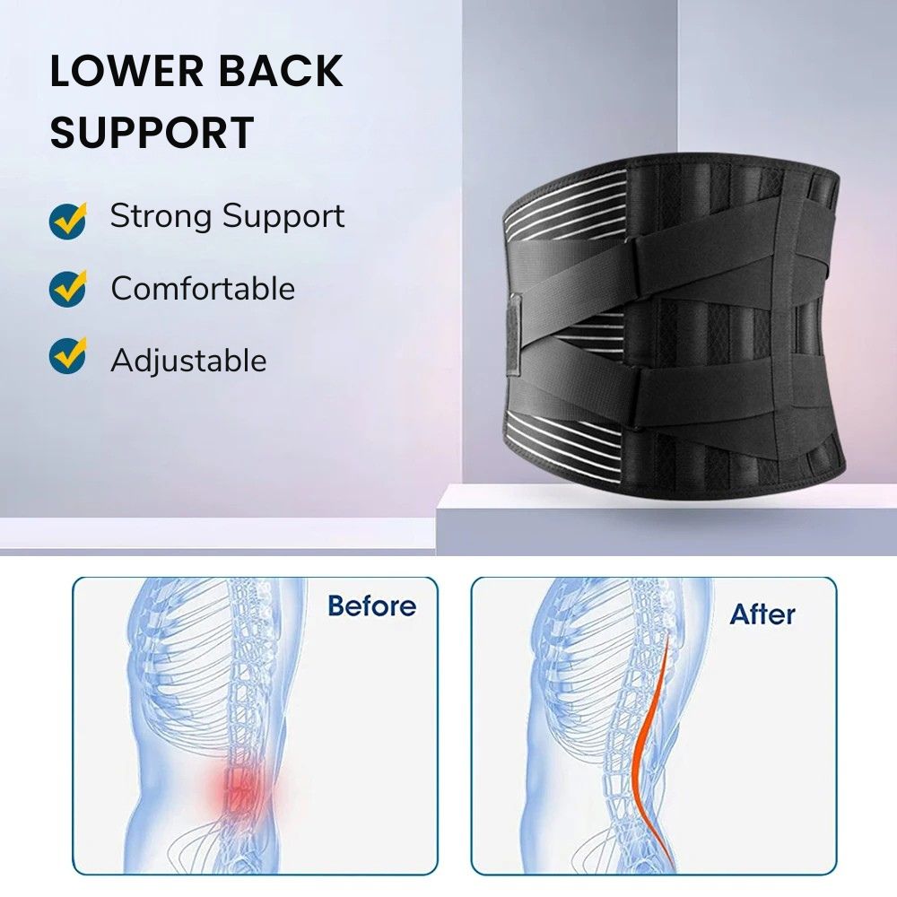 Say goodbye to lower back pain with our Adjustable Lumbar & Spine Support Belt — engineered for comfort, support, and everyday use. Its 4 memory-aluminum stays and 2 steel springs provide 360° vertical support to stabilize your spine, ease muscle strain, and reduce disc pressure. Made from 4-way stretch elastic with a velvet-soft inner lining, this belt is breathable, lightweight, and comfortable to wear under clothes. Dual elastic straps offer targeted compression to prevent injuries during lifting, sitting, or standing, while silicone anti-slip bands keep the belt securely in place. Reinforced double seams ensure long-lasting durability. Available in multiple sizes for the perfect fit, this belt is ideal for relieving sciatica, disc herniation, scoliosis, or everyday posture support.
