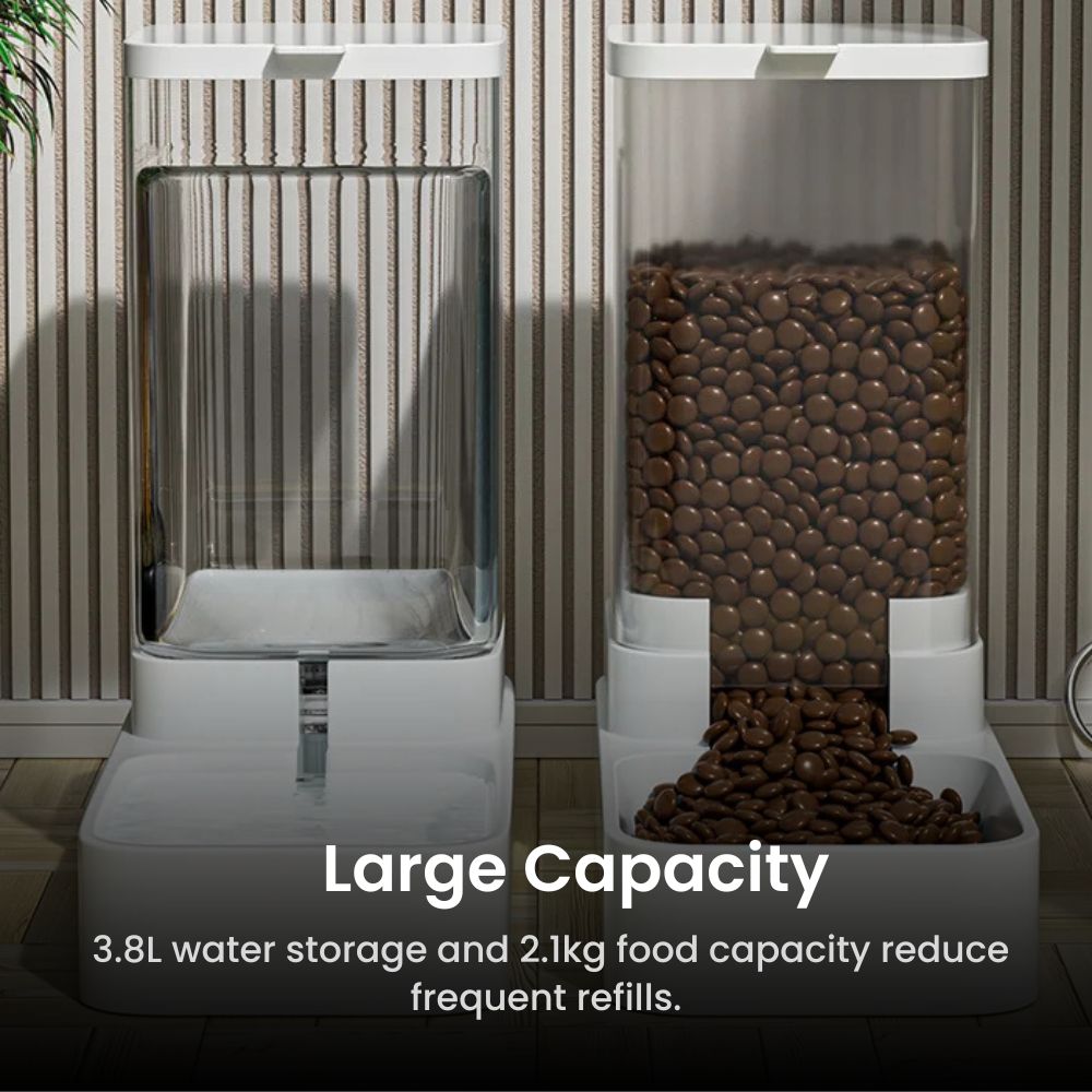 Keep your pets happy, healthy, and well-fed with this automatic feeder and water dispenser. Featuring a gravity-fed system, it ensures your pets always have access to fresh food and clean water without constant refills. The 3.8L water tank and 2.1kg food storage capacity are perfect for cats, dogs, and multi-pet households. Built with safe PP+PE material, this feeder is both durable and resistant to wear, while its sleek design complements any home. The transparent containers make it easy to track levels at a glance, and all parts are easy to clean. Designed for convenience and reliability, this feeder is ideal for busy pet owners.