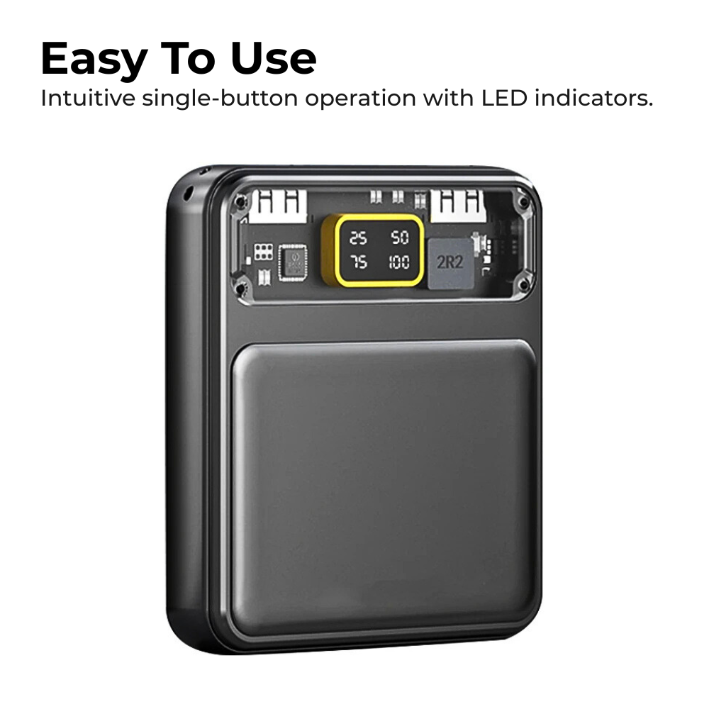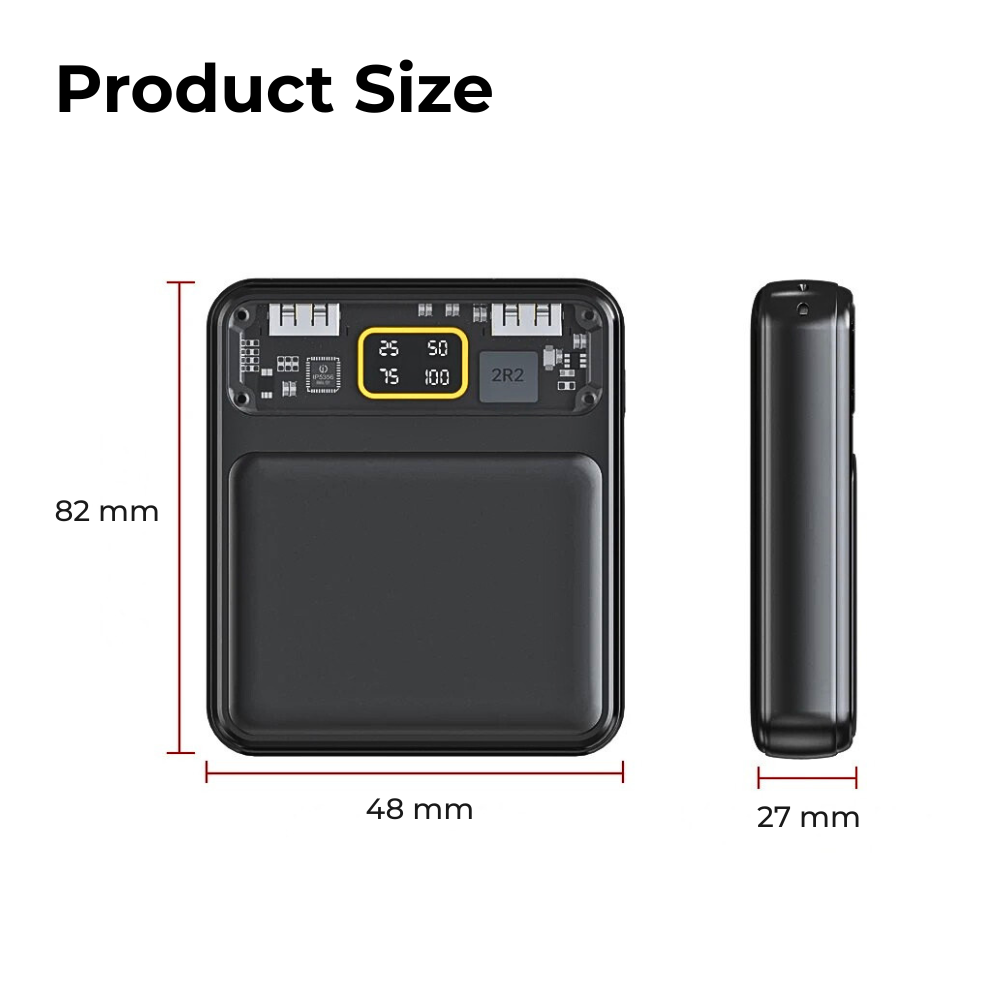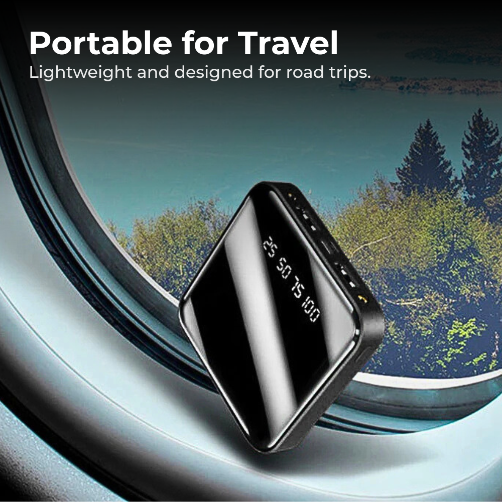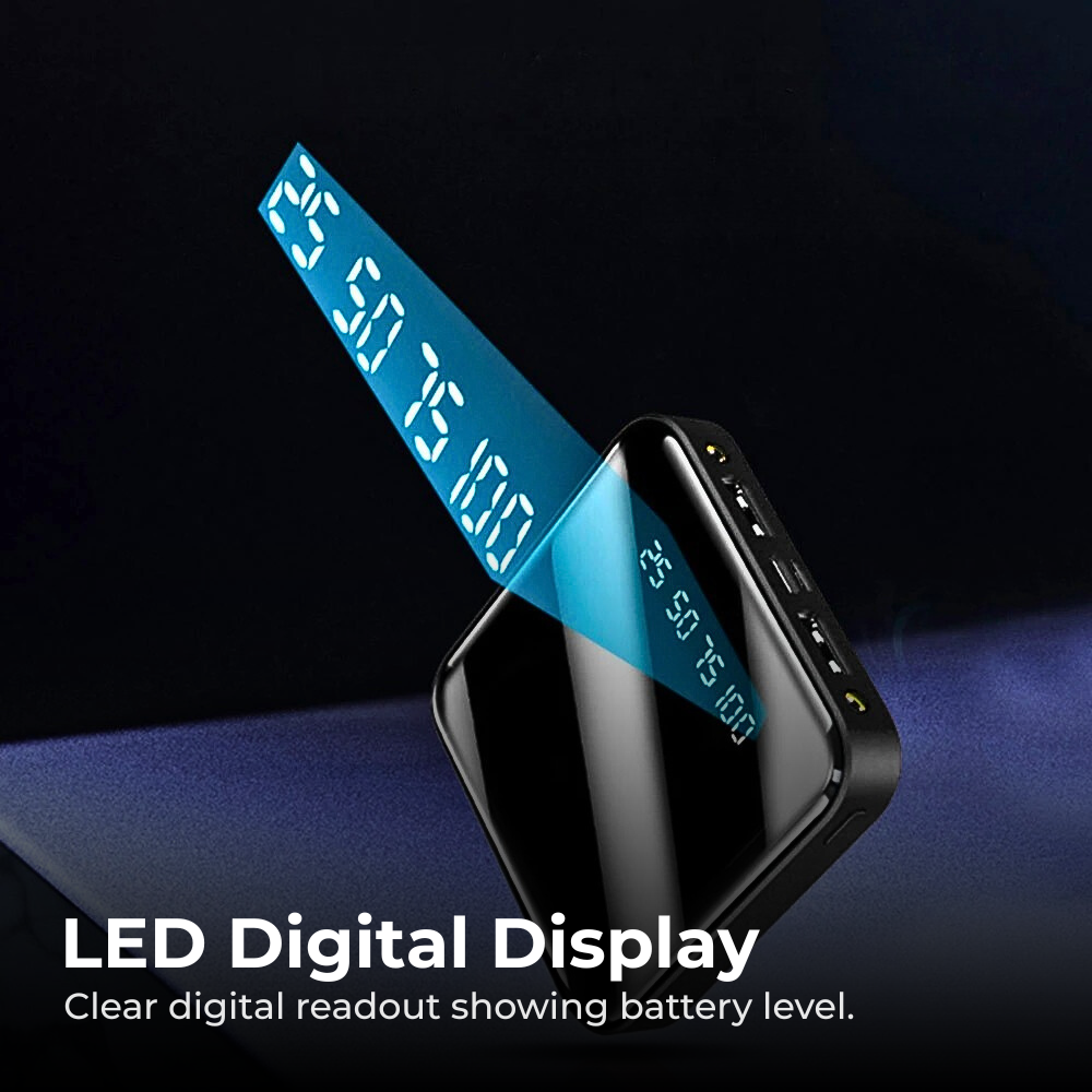 A sleek, pocketable power bank cover that combines stylish mirror finishing with practical portable power — this mini case houses convenient Type-C and Micro USB charging inputs, a USB output to charge phones and accessories, a bright built-in LED flashlight for emergencies, and a clear LED digital display so you always know remaining battery — lightweight and travel-ready, it slips into your bag or glove box and keeps your devices powered on the go with multi-protection safety features for peace of mind.