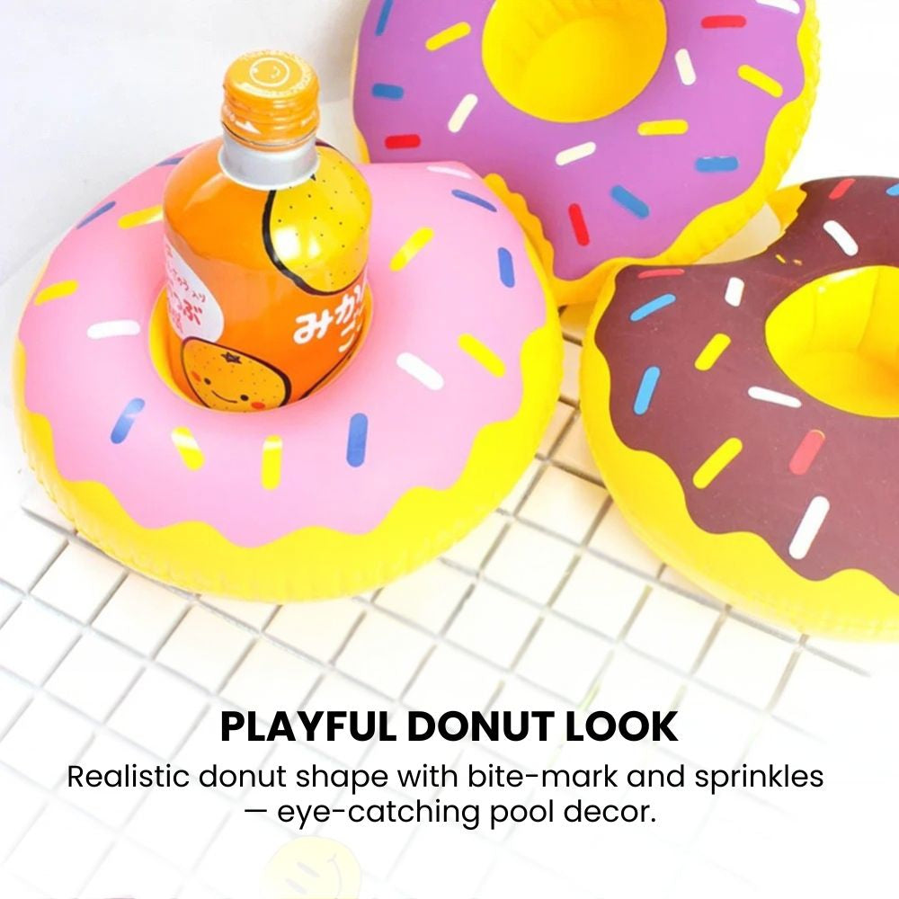 A playful, durable inflatable donut drink holder that keeps your drink floating beside you — designed with a fun “bite” and sprinkles to add personality to pool parties, beach days, and backyard fun; made from tough, puncture-resistant PVC, it inflates quickly, fits most cans, bottles and cups, and is lightweight for easy transport and storage, making it the perfect companion for chill afternoons or lively gatherings where you want your beverage nearby and your hands free.