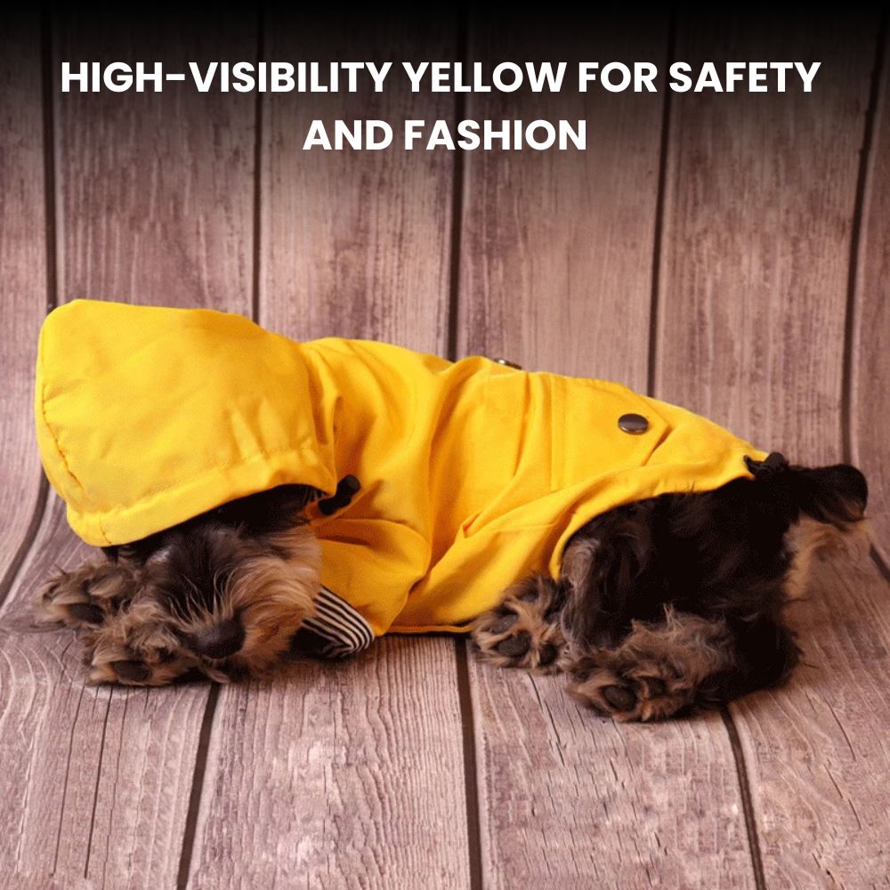 A must-have for rainy-day walks, this Yellow Waterproof Dog Raincoat blends reliable weather protection with everyday comfort — the water-repellent outer shell sheds rain and wind while the soft striped inner lining keeps your pup warm; a detachable hood with faux-fur trim, snap-button front, leash hole and adjustable waist deliver practical convenience and a snug fit; reflective accents improve visibility on low-light strolls, and easy-care construction makes it simple to clean — perfect for small to large breeds that need stylish protection from the elements.