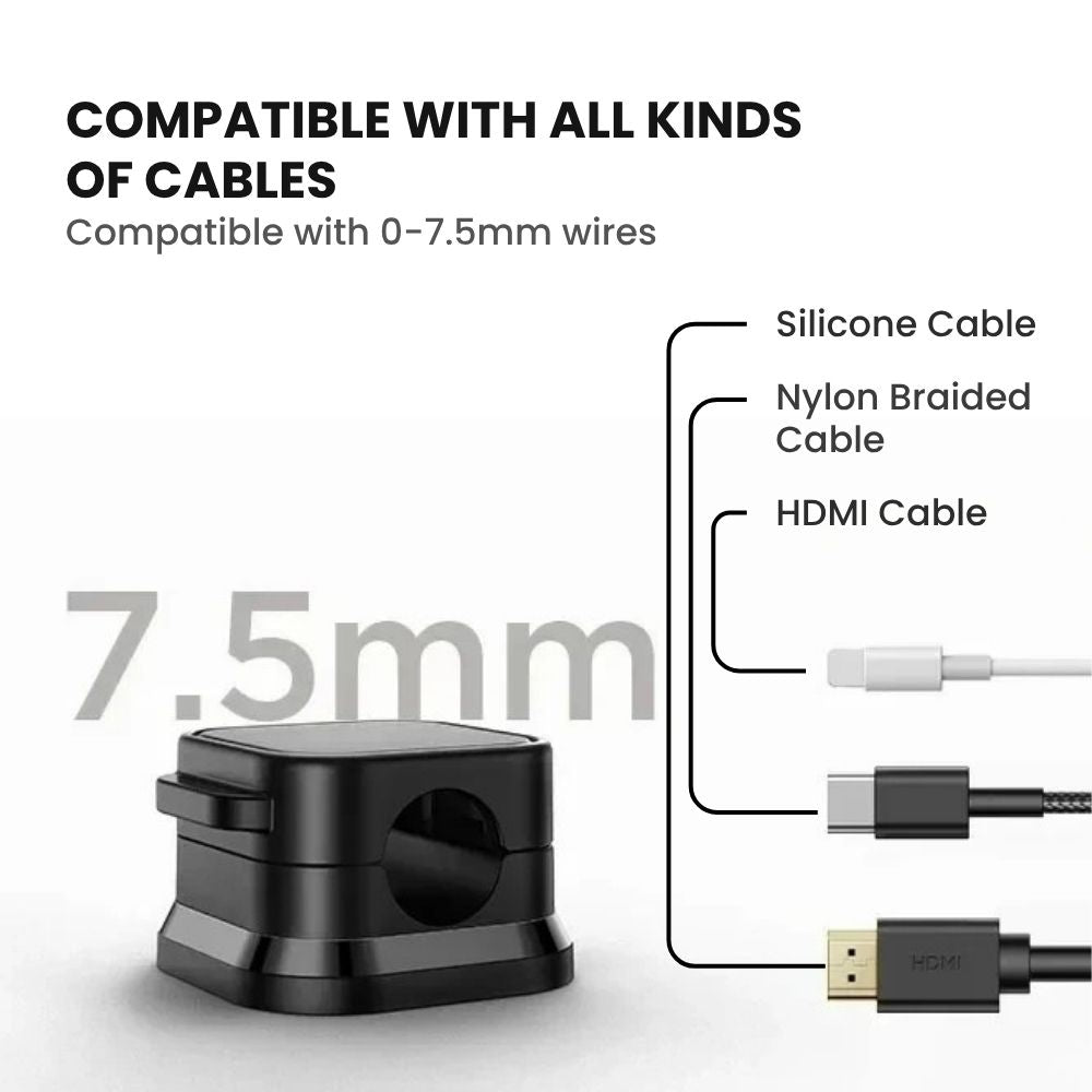 | Cable Compatibility | Up to 7.5 mm diameter (USB, Lightning, Type-C, earbuds) |