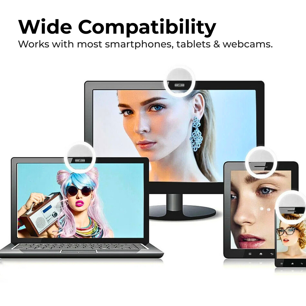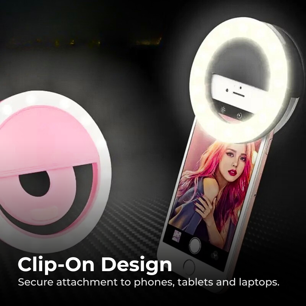 This compact, USB-rechargeable clip-on selfie ring light instantly upgrades your photos and videos with soft, even illumination β three adjustable brightness levels let you find the perfect light for makeup, selfies, video calls, and social posts; its lightweight clip fits most phones, tablets and laptops for hands-free use, and the portable design and included USB cable make it easy to charge and take anywhere so you always look your best on camera.