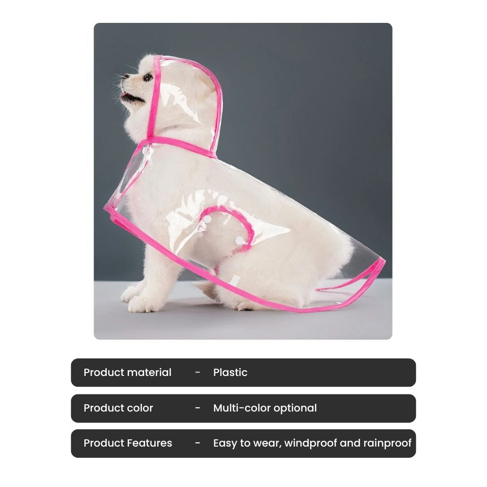 Keep your pup dry, safe, and stylish on rainy walks with this Clear Reflective Dog Raincoat — a lightweight, transparent rain shell with a hood, reflective piping for night visibility, an integrated harness opening for leash access, and adjustable Velcro straps for a snug, comfortable fit; easy to put on and clean, foldable for travel, and available in multiple trim colors and sizes to fit small and medium breeds — perfect for everyday walks, travel, and unexpected showers.