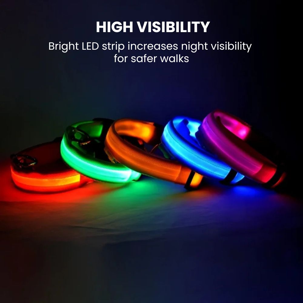 Keep your dog visible, comfortable, and stylish after dark with this USB-rechargeable LED Dog Collar — designed for everyday walks and late-night adventures, it pairs a bright, flexible LED strip with a durable adjustable nylon strap and secure quick-release buckle so it fits comfortably on small to large dogs; choose from multiple vivid colors and light modes (steady, slow flash, fast flash) to match your mood or increase visibility, recharge quickly with the included USB cable and enjoy long runtime between charges — the collar is splash-resistant for rainy walks, easy to clean, lightweight for everyday wear, and built to stand up to active pets while making your dog more visible to drivers, cyclists, and passersby for safer night walks.