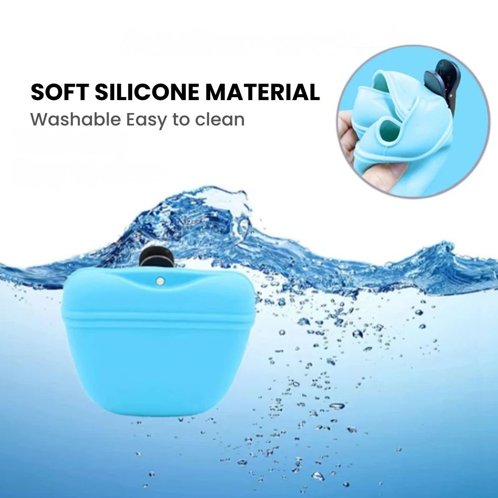 A compact, soft-elastic snack pouch built for outdoor training and everyday walks: this portable treat pack keeps dry kibble, meat chunks and small snacks secure while giving you quick, one-handed access thanks to its magnetic automatic closure and clip-on design; the silicone body is moisture-resistant and quick-drying for easy cleaning, plus the soft, flexible material is comfortable to handle and won’t crack or deform — lightweight and small (10cm × 13cm), it clips to belts, leashes or bags so treats are always within reach, perfect for training, hiking or everyday outings.