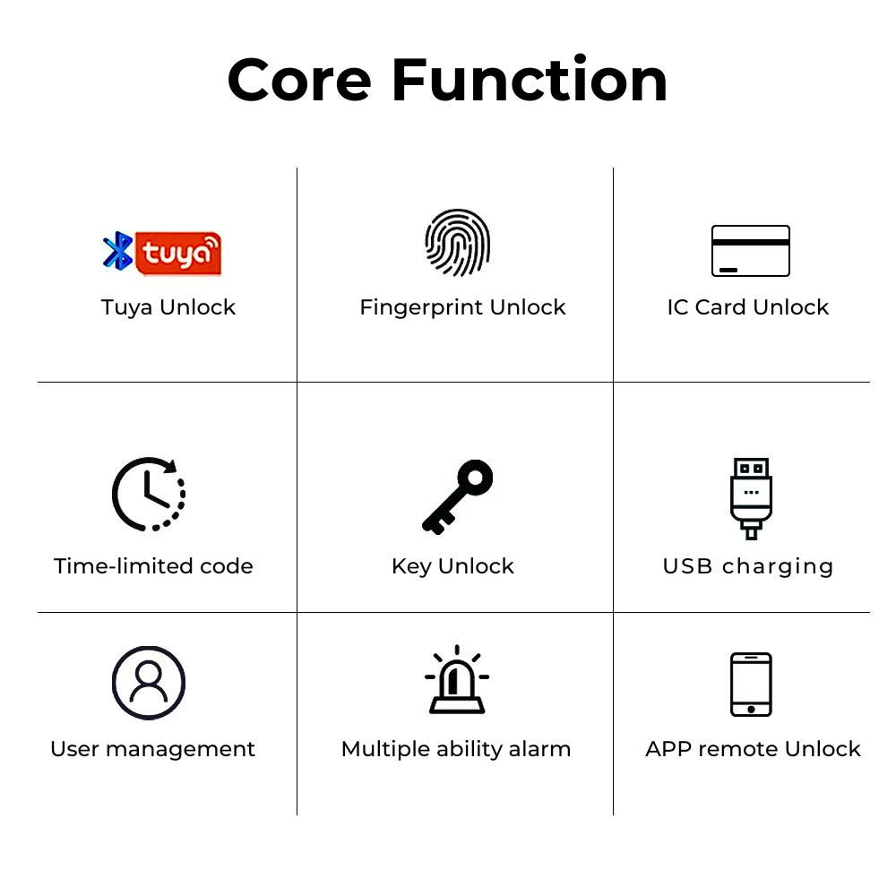 Unlock Methods | Fingerprint, PIN code, RFID card, Tuya Smart App (Wi-Fi/Gateway required for remote), Mechanical key |