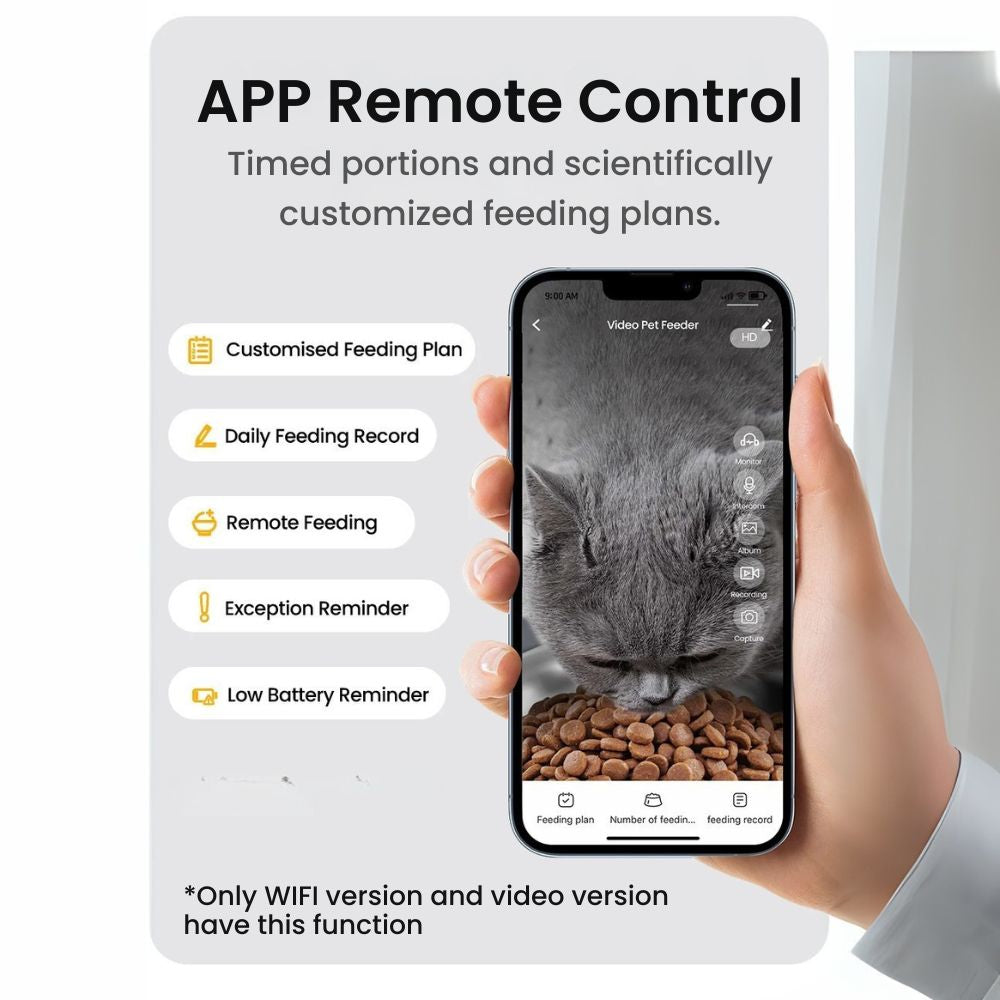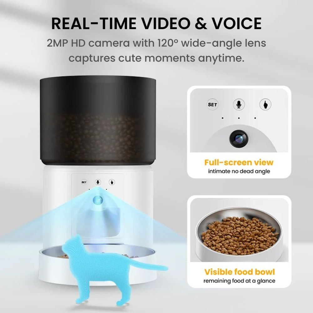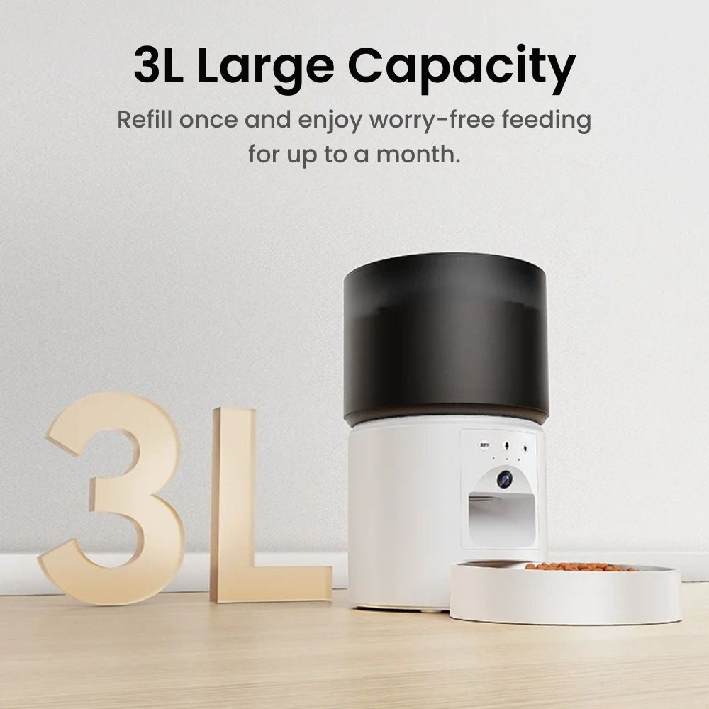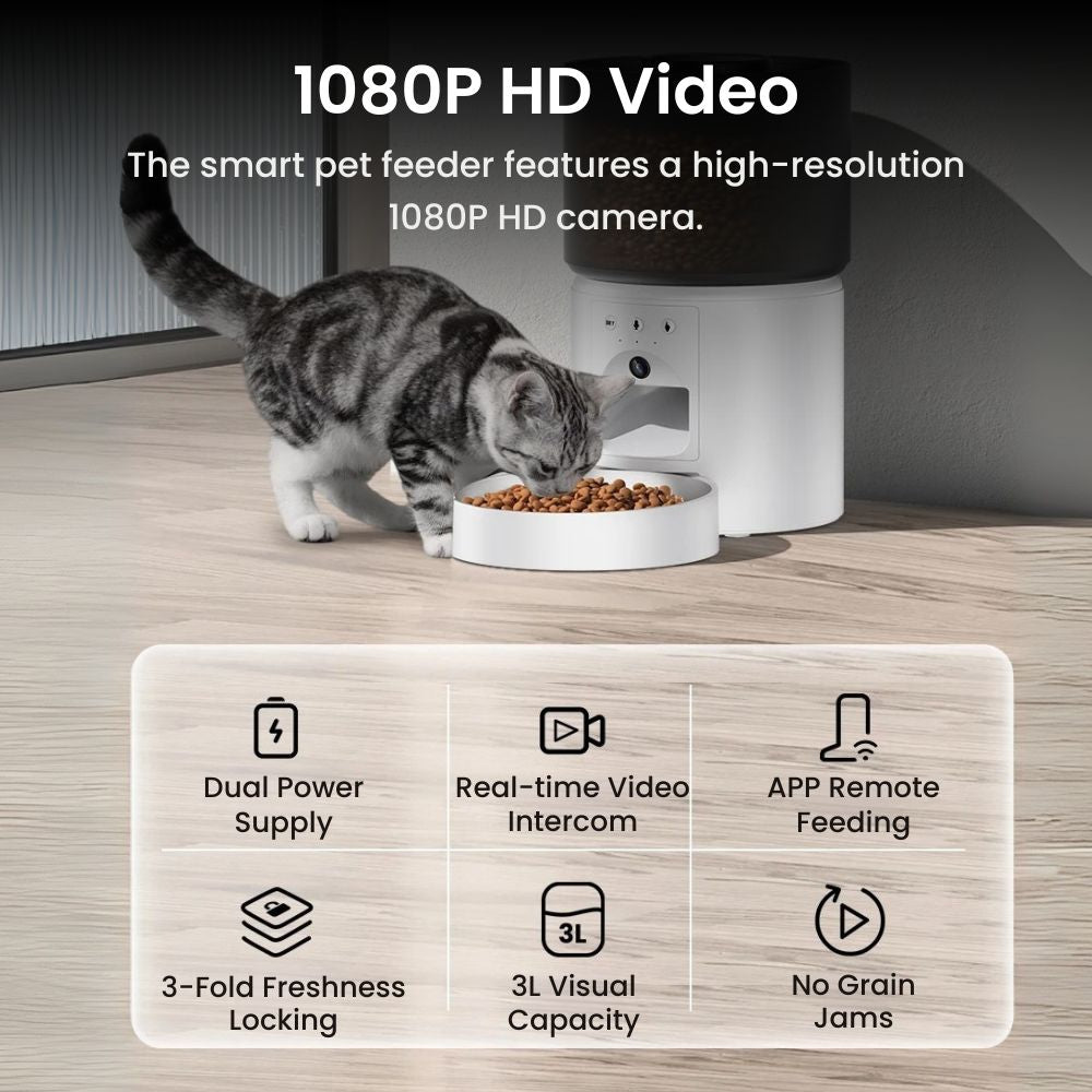 Make mealtime worry-free with this smart automatic pet feeder. Designed for cats and small dogs, it delivers precise portions and reliable schedules so your furry companion is always cared for. The built-in 1080P HD camera with night vision lets you monitor your pet day or night, while two-way audio keeps you connected with real-time interaction. You can record a custom 10-second meal call, control feedings remotely via the app, and rely on its anti-jam system for smooth food dispensing. With a widened grain outlet, 3L capacity, and 4-fold freshness sealing, food stays crisp and clog-free. Dual power supply ensures feeding even during power outages, while its removable structure makes cleaning simple. Whether you’re at work, traveling, or just out for the day, this feeder gives you peace of mind and your pet a healthier, happier routine.