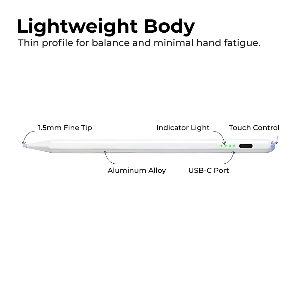 Experience smooth, precise drawing and writing on your iPad with this Magnetic Rechargeable Stylus Pen — slim, lightweight and finished with a fine-texture round feel for comfortable grip; instantly attach it to your iPad with the built-in magnetic design, power on/off with the Smart Touch Switch, and rely on Type-C fast charging and an LED power display that lets you know battery status at a glance — up to ~10 hours of continuous use, quick 1-hour recharge, long standby and power-saving modes keep the pen ready whenever creativity strikes; perfect for sketching, note-taking, annotating and precise navigation.