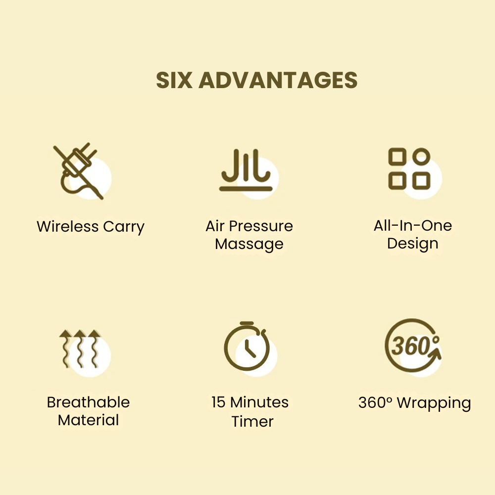 Designed for daily comfort, recovery, and circulation support, this Air Compression Leg Massager delivers soothing, rhythmic pressure therapy that mimics professional massage techniques to help reduce swelling, relieve muscle fatigue, and refresh tired legs. Whether you sit for long hours, stand all day, travel frequently, or recover after workouts, its intelligent air compression system targets the calves and lower legs with customizable intensity and massage modes for personalized relief. Lightweight, cordless, and rechargeable, it allows you to relax anytime at home, at work, or on the go—helping improve blood flow, ease stiffness, and leave your legs feeling lighter, energized, and refreshed after every session.