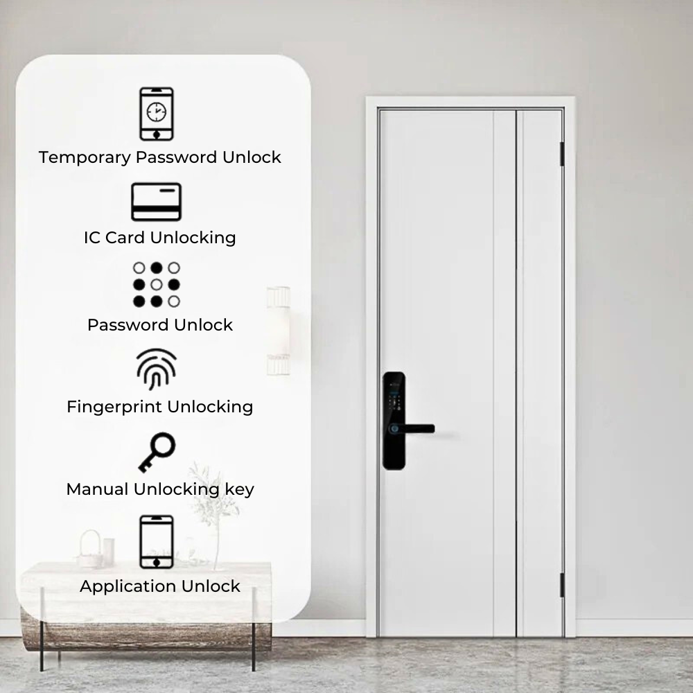 Unlock methods | Fingerprint, Tuya App (remote), PIN (touchscreen), IC card, Mechanical key, Temporary password |